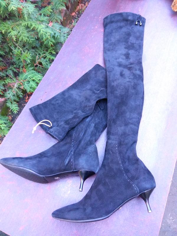 Круті модні чорні ботфорти із натуральної замші Ermanno Scervino 38,5 розміру. В обтяжку по формі ноги, так звана "друга шкіра"! Довжина устілки 24,5 см, загальна висота чобота 70 см, каблук 4,5 см, обхват халявки зверху 38 см (по всій окружності вставлена силиконова стрічка для гарного тримання на нозі), шкіра ботфорта стрейчева, тому тягнеться далі. Також для зручності одягання з внутрішньої сторони вшита блискавка.