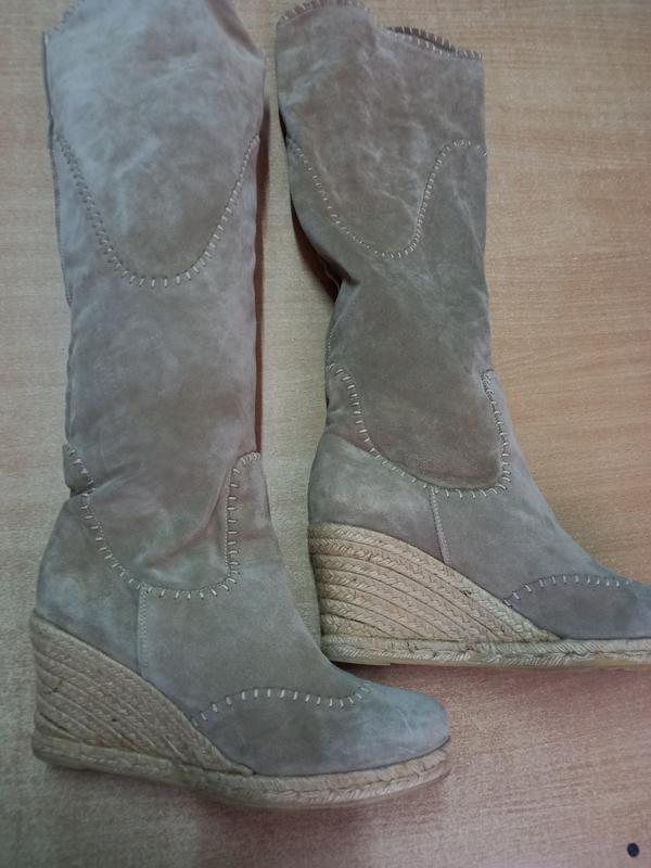 Нубук отличного качества,немного нужно почистить.Стелька 26 см,ширина 8,5 см,платформа 8 см,под стопой 1,5 см,высота 53 см,халява 20 см