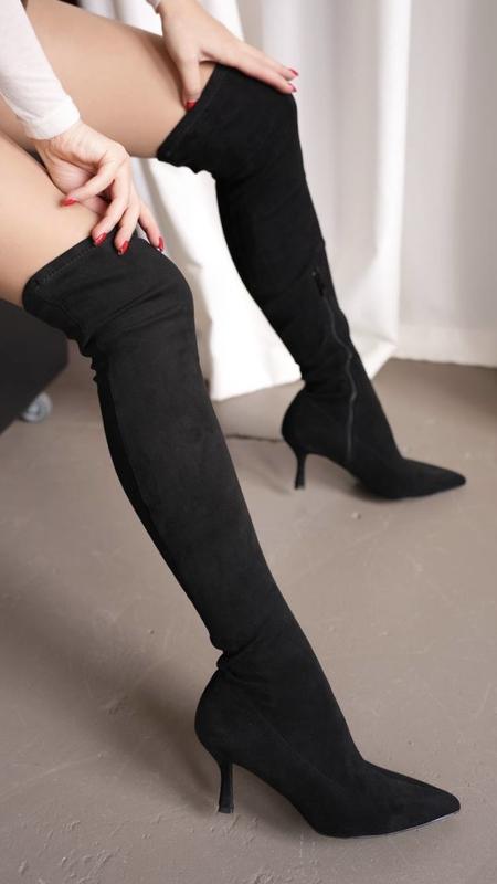 Ботфорти чоботи на підборах з вузьким носком еко замшеві чорні осінь весна демі жіночі