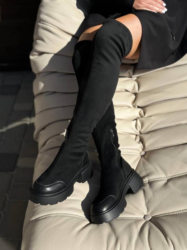 Код 25089 Размеры 36-41 Ботфорти Материал - Экозамша стрейч / Экокожа Внутри - Флис Сезон - Деми Цвет - Черный Высота от пяточки - 55 см Подошва - 6 см/ 3,5 см На среднюю стопу Маломерят 36-23 37-23,5 38-24 39-24,5 40-25 41-25,5