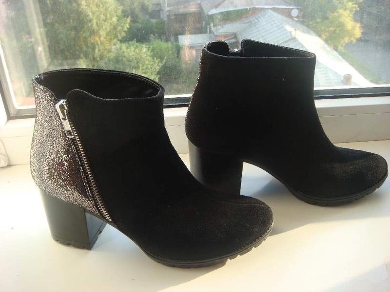 Мега-стильные демисезонные ботинки . Модель отличают непревзойденная по удобству проверенная покупателями колодка.Выполнены из натуральной замши черного цвета, сбоку вставка из натуральной кожи серебро с отливом (кожа шиммер). Каблук ровный - 6 см высотой. Рабочая молния расположена оригинально ― наискось по наружной стороне. Молния металлическая японского бренда YKK . Внутри обувная байка черного цвета. Размер 36 - длина стельки от края и до края 23,9 см, на ножку 23,5 см среднюю по полноте с не высоким подъемом!!! Были одеты 2 раза- состояние -как новые , то что носились видно только на набойке - на фото показала. Наложкой отправляю только по предоплате за пересылку туда и обратно ( 130 грн для НП) В наличии! Оплата на карту ПриватБанка+ 0,5% комиссия. отправлю Новой Почтой- за доставку оплатите при получении или Укрпочтой