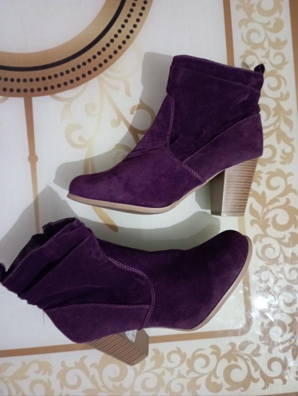 Очень классные ботильоны сливового цвета из искусственной замши, длина по стельке 25 -25,5, ширина 9, каблук удобен 7 см. Стан новых.