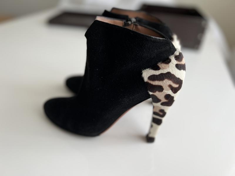 Ботильоны замшевые, каблук из кожи пони, коробка в комплекте. На правом каблуке присутствует вытекаемость от управления авто