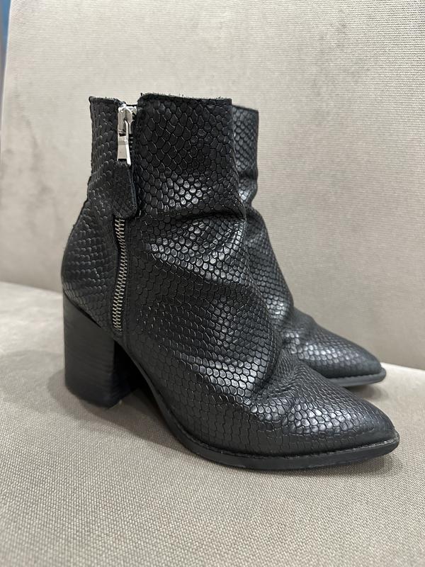 Сапожки на каблуке, полностью натуральная кожа, 36 размер, принт под питон, 22,5 см стелька, купленные за рубежом, высота каблука 7 см, ширина в голени 10 см. Одела пару раз