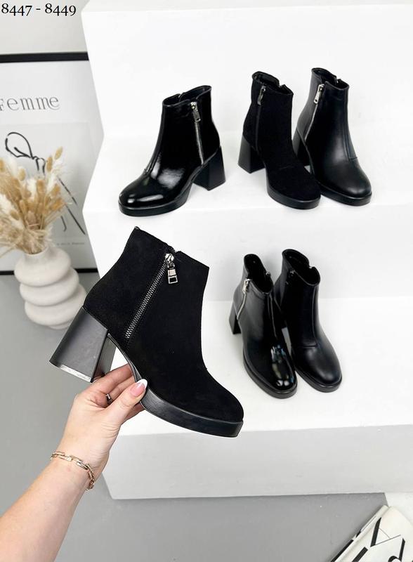 🙌 Пополнили код 8447 - 8449 ▫️ деми к**********-1 ▫️ зима 🔹Ботильоны 🔹Натуральная кожа, замша, лак - Италия Деми - внутри байка, Зима - (набивной мех - 30 % овчины) 🔹цвет - BLACK ▫️каблук 7,5 см, ▫️подошва 2 см высота от пятки 12 см, объем края 26-28 см ▫️боковая молния декор, внутренняя рабочая 🔸Топ качество 🔹размеры 36-40 деми 2650грн ЗИМА ▫️2750 грн 36=23,5см 37=24 см 38=24,5 см 39=25,2 см 40=26 см ✅ отшил - доступен Уточняйте наличие нужного размера перед оплатой. Полная оплата или передоплата после платой 200 грн.