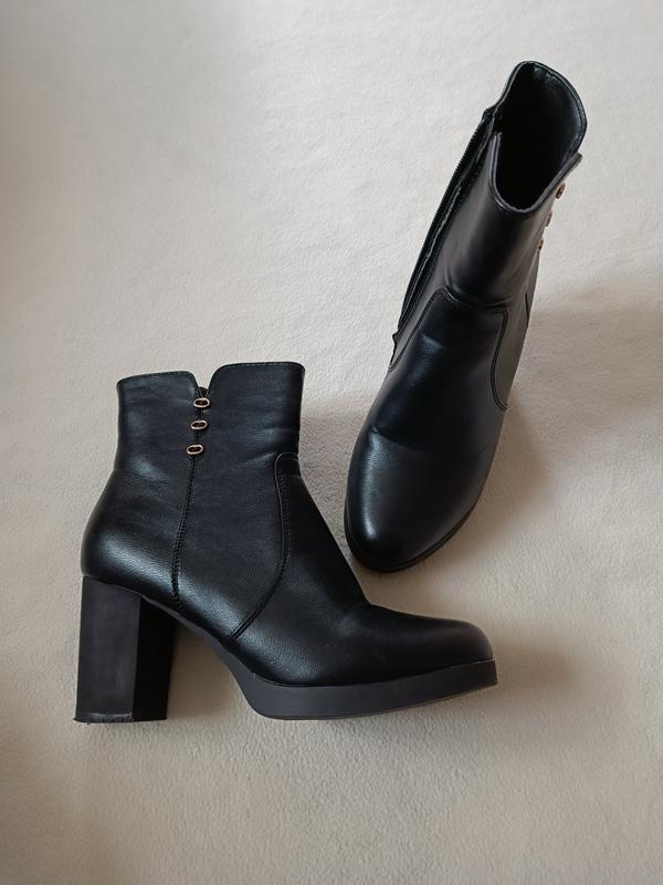 женские ботильоны на узкую ножку. Материал: снаружи экокожа, внутри - по типу микрофибры. Цвет: черный, фурнитура золотистая, все как на фото. Размер: стандартный 37. Длина стельки: 23.5 см. Высота каблука по заднику: 8 см. Высота платформы в передней части: 1,3см. Застежки: молнии с внутренней стороны. Сезон: демисезонные осень/весна. Состояние: б/в, есть следы носки (зировала 3-4разы), но в целом состояние хорошее, каблуки очень прочные и устойчивые, набои не изношенные. Стан можно оценить по фото. Особенности модели: элегантный женственный дизайн, универсальный и стильный, который подойдет под все.