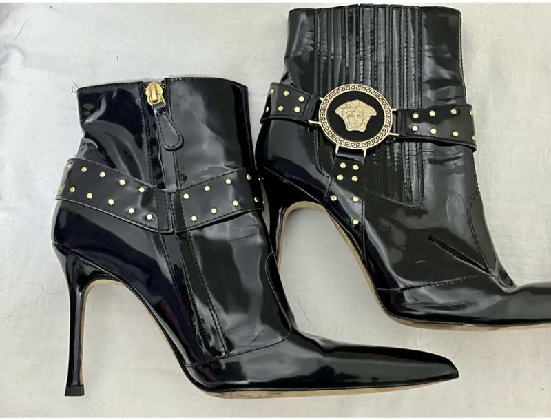 Ботильоны на шпильке Versace Medusa в черном лакированном цвете с золотистой фурнитурой эластичные вставки для комфорта, Молния с внутренней стороны. Они в очень хорошем состоянии с минимальными признаками износа, очень легкие на кожаной подошве и поверхностные потертости на каблуке Размер 39, высота каблука 9,5 см,