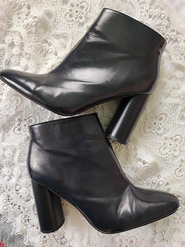 Стильные комфортные повседневные ботильоны ZARA из лаковой кожи. Цвет тёмно-синий, практически черный. Стелька 26 см. Круглый стильный устойчивый каблук, высота 10 см ., диаметр 4 см . Классический носок. На среднюю ножку. В щиколотке ПО 13 см. Металлические замки. Смотрятся потрясающе. Состояние идеальное. Обувались один раз. Набойки фабричные, замена не требуется.