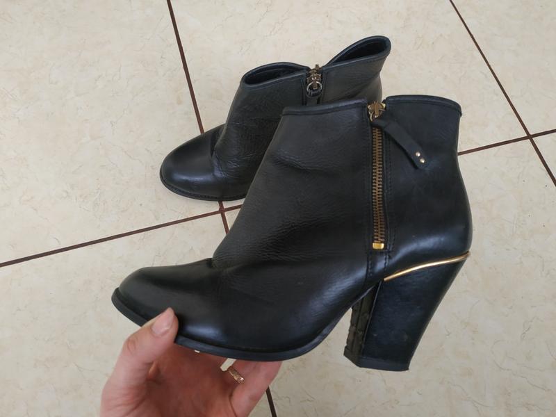 Шкіряні ботильйони на каблуку. Верх шкіра натуральна. Каблук і всередині шкірзам. З дефектів: на каблуках є пошкодження шкірзаму і всередині трохи обліз шкірзам. Все показала на фото. Шкіра дуже якісна. Виробництво Португалія. Каблук 9см. Розмір 39-й планомірний. Довжина устілки 25-25,5 см Ціна чисто символічна, щоб не лежали без діла.