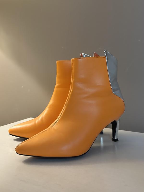 Помаранчево-сріблясті ботильони на застібці з гострими носочками на невисоких підборах.