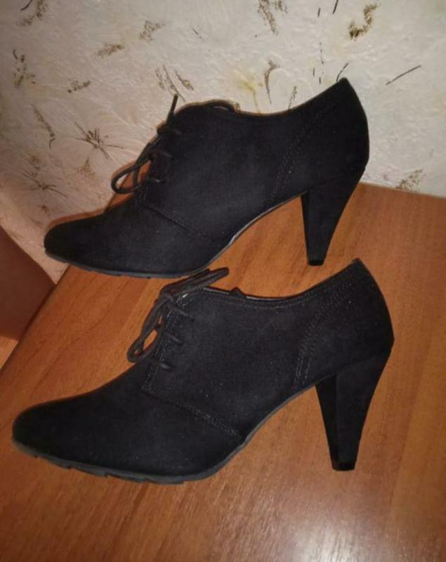 Материал верха - "под замшу", внутри и стелька - козырь. Размер 42. Стелька несъемная, длина от края до края около 27,7 см, ширина около 8 см, на широкую ногу не подойдут. Высота каблука 8,5 см. Состояние новых, но есть нюанс от неправильного хранения - виден на последнем фото (потертость), на общем фоне в глаза не бросается, можно одевать под длинные брюки, которые закроют это место. Цвет черный.