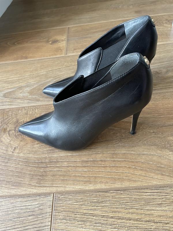 Чорні низькі ботильйони бренду Guess. Оригінал навіть з рідною коробкою. Мої власні, носились, є сліди носки на підошвах і подряпини (див. фото) потерті обидва миски, на правій туфлі треба міняти набойку. Набойки рідні. По боках є подряпини. Вказаний розмір 36, але я носила на 37 вузьку ногу. Якщо нога широка, то сяде на 36 скоріше. Висота підбора 10 см. Продаю, бо вже не ношу такі високі підбори.