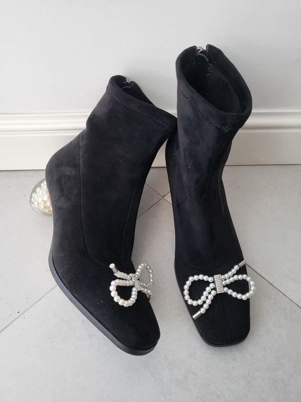 Очень классные ботильоны из эко замши, необычные с каблуками из жемчужин, бантики можно регулировать, так как они из проволоки. Узировала один раз всего, большие, размер 39, стелька 26 см, это прямо от края до края, но но но но носок узкий на конце. Идут на полный 39-39,5. На подошве еще есть пленка.