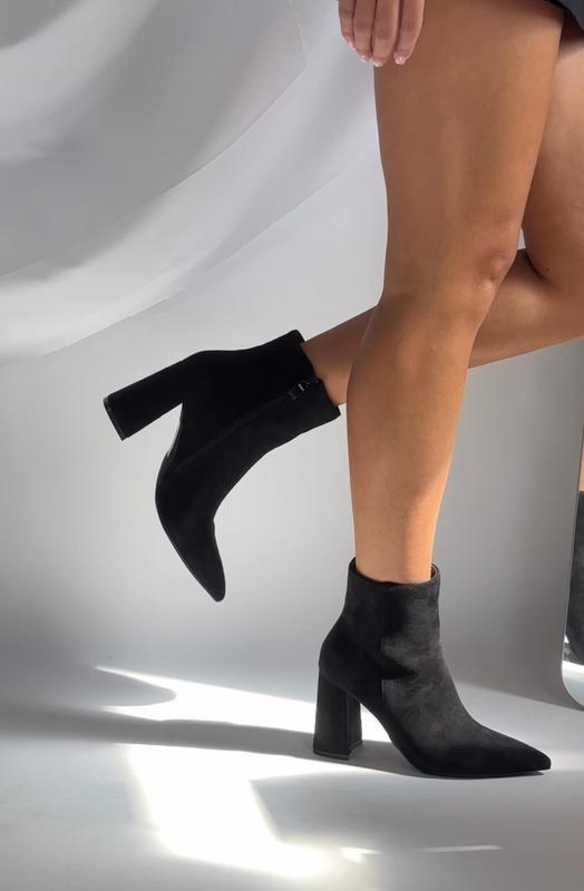 🔻розмір: 36;37;38;39;40;41 🔻заміри: 23-23,5см 23,5-24см 23,5-24см 24-24,5см 24-24,5см 25-25,5см 25-25,5см 25,5-26см 25,5-26см 26-26,5см каблук - 8,5 см ширина устілки - 7,5см 8 8,5 9 высота Повна - 21,5 см ширина зверху- 14 см 🔻стан: нові 🔻матер‘ял : еко замш 🔻утеплювач : на флісі 🔻колір : чорні