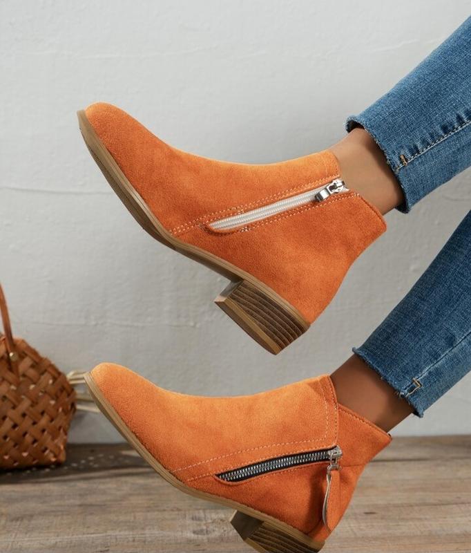 Яркие красочные ботильоны оранжевого цвета из искусственной замши на 3,5 см каблуке, с застежкой из молнии внутри и с декоративной молнией снаружи. Размер указан 39, однако длина стельки 25 см, ширина 7,5 см, что соответствует 38- ому размеру.Высота ботильона от каблука 10 см.