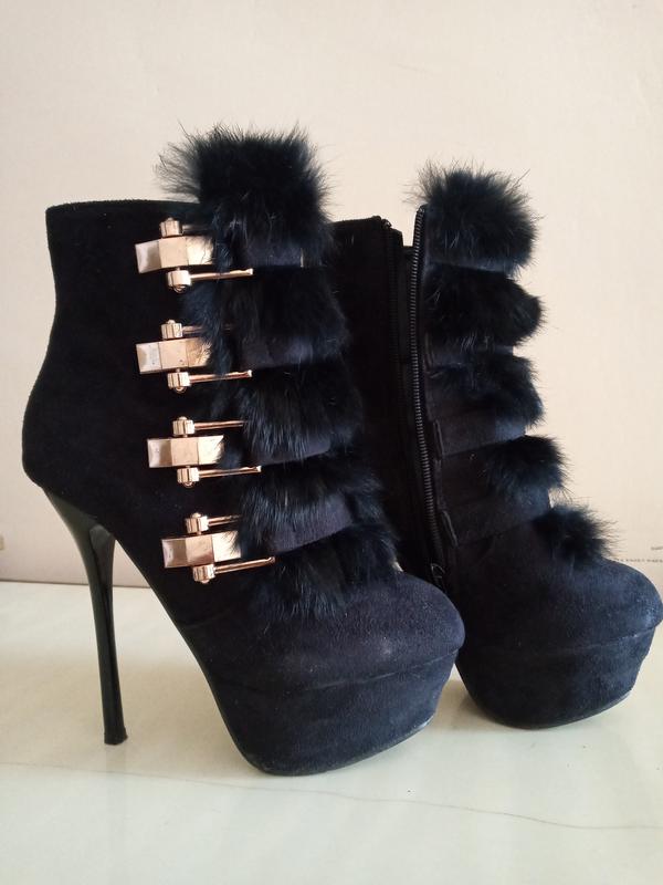 Чёрные ботильоны с мехом и золотыми украшениями. каблук 14см платформа 4см . внутри небольшое утепление. Состояние идеальное. одевались один раз.