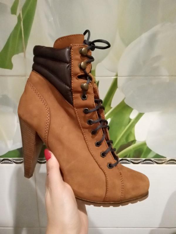 Натуральна замша ( можливо нубук) . Манжет верхній, темно - коричневий із еко шкіри, піддулась з середини ...- можна нашити чорнобурку зверху і прикрити. Має потемніння на замші. Каблук - 10.5 см , стійкі.