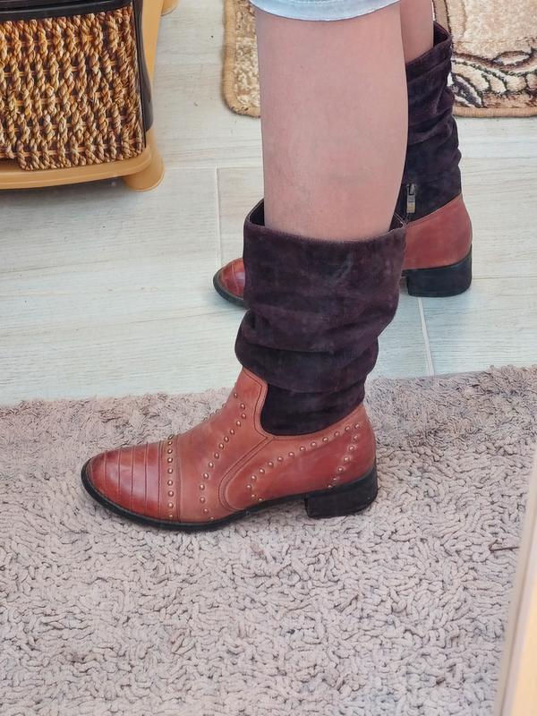 Полусапожки из натуральной кожи и натуральной замши цвет горчичный и коричневый. Состояние верха без повреждений. Внутри очень мягкая и приятная микрофибра под леопард. Они очень удобные. Есть изъян-не аккуратно подбит каблук. Стелька 26,5, ширина-9, каблук-4 Маломерят на размер. В носке этого не видно, но можно отнести в мастерскую, что бы переделали. Распродаю свой гардероб, много хороших вещей, состояние идеальное, я очень аккуратно отношусь к вещам. Есть новые.Присланные из Америки. Есть неношеные. Всегда есть подарок. Смотрите другие мои продажи. Буду очень Вам рада. 100% предоплата на карту ПРИВАТ, ОТП, ПУМБ. Отправляю НП, Укр.П, Джастин. Отправка за счет покупателя.
