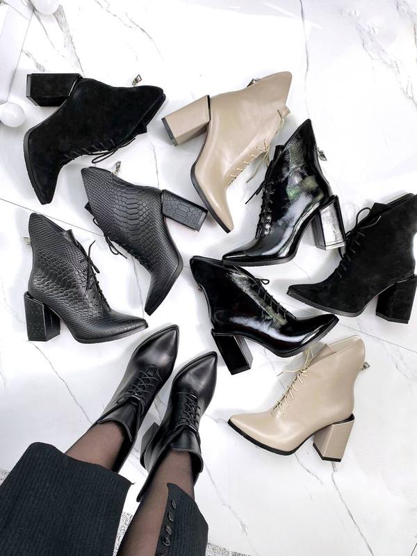 ✅ Н О В И Н К А к-3304 черный лак к-3305 черная кожа рептилия к-3306 черный замш к-3307 черная кожа к-3308 мокко кожа Ботильоны натуральные - Milona материал: верх-натуральная замша и кожа. Внутри утеплены байкой. Зима- набивной мех высота каблука 9,5 см. Высота ботинка от пятки 14 см. Сзади рабочая молния. Подьем регулируется шнуровкой. размерность: 36-40 размер в размер пр-во Украина ✅ доступны к отшиву под заказ 36= 23.5 37= 24 38= 24.5 39= 25.5 40= 26 деми: 2350 зима: 2500