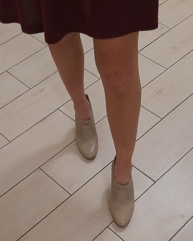 Туфлі-ботильйони з перфорацією, натуральна шкіра, зовні і всередині, нюдовий колір, розмір вказано 35, але більшомірять, будуть на 36. Ззаду на блискавці. Відмінна якість, вироблені в Польщі. Нові, без бірок, купувала собі, але не ношу (замалі, мій 36,5-37).