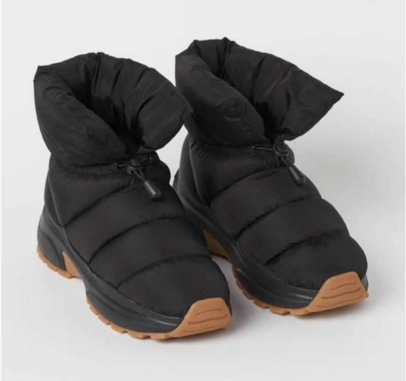 Сапоги, похожие на кроссовки, из нейлона, стеганые и с мягкой подкладкой. Голенище на резинке и кулиске. Подкладка и стелька из флиса. Толстая резиновая подошва. Высота подошвы 7 см. Состав - Подкладка и стелька: 100% полиэстер. Верх: 100% полиамид. Подошва: 100% резина. Более экологичные материалы. 100% переработанный полиамид.