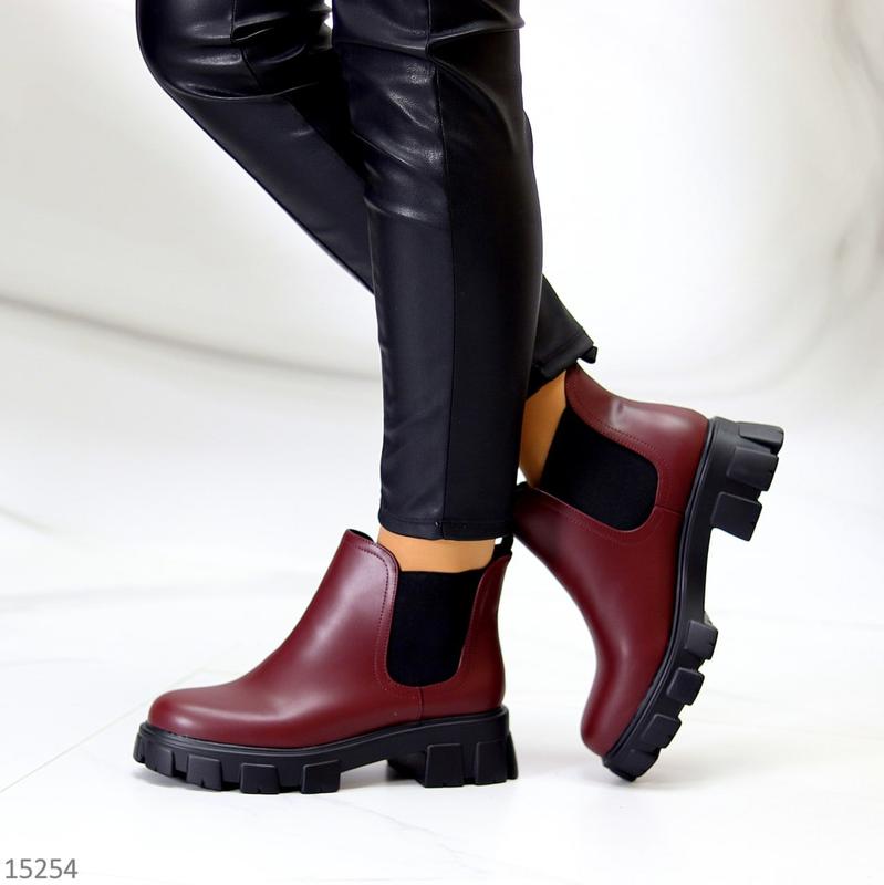 Розміри 36-40 Черевиики Матіерал - Екошкіра/Еластичні вставки з боків Всередині - Ворсистий фліс/Текстиль на п’ятці Колір - Марсала Висота від п’ятки - 11см Підошва - 5см/3см На середню стопу Розмір у розмір 36-23,5 37-24 38-24,5 39-25 40-26 900 грн