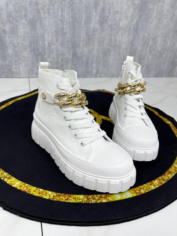 Код 375 Черевики Матеріал: еко шкіра Колір: білий Фурнітура знімається Висота підошви 5,5 см На середню стопу і ближче до широкої теж підійдуть Маломірять: 36-23 см 37-23,5 см 38-24 см 39-24,5 см 40-25,5 см