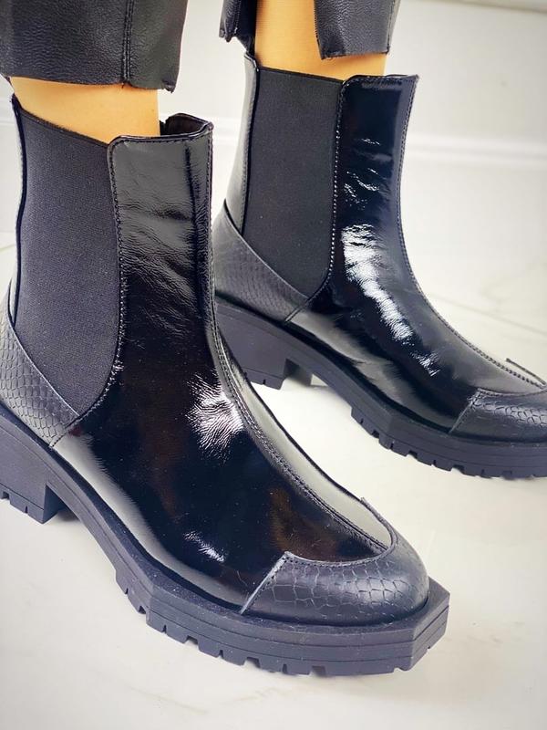 Нова модель доступна до замовлення 🙈😍 Код 10055 (байка) Код 10055-1 (хутро) Черевики Marri. Натуральна лакована шкіра. Підошва спереду 2 см, позаду 4,5см. Висота від п'яти 14 см. Обхват 27см. Розмірний ряд: 36-40 Колір: чорний. Зроблено в Україні. Байка: 2550 Хутро: 2750