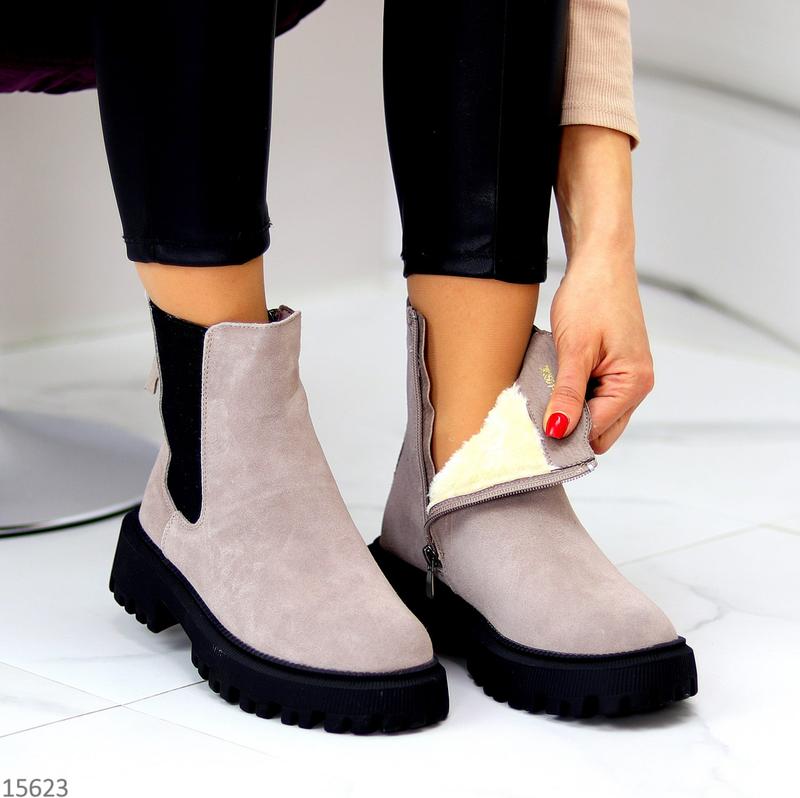 Черевики Розміри: 36-41 Матеріал: натур замша Всередині: екохутро Сезон: зима Колір: сірий Висота від п’ятки: 15,5см Підошва: 5см/3,5см Виробник: фабричний Китай На середню стопу Розмір у розмір 36-23,5 см 37-24 см 38-24,5 см 39-25 см 40-25,5 см 41-26 см