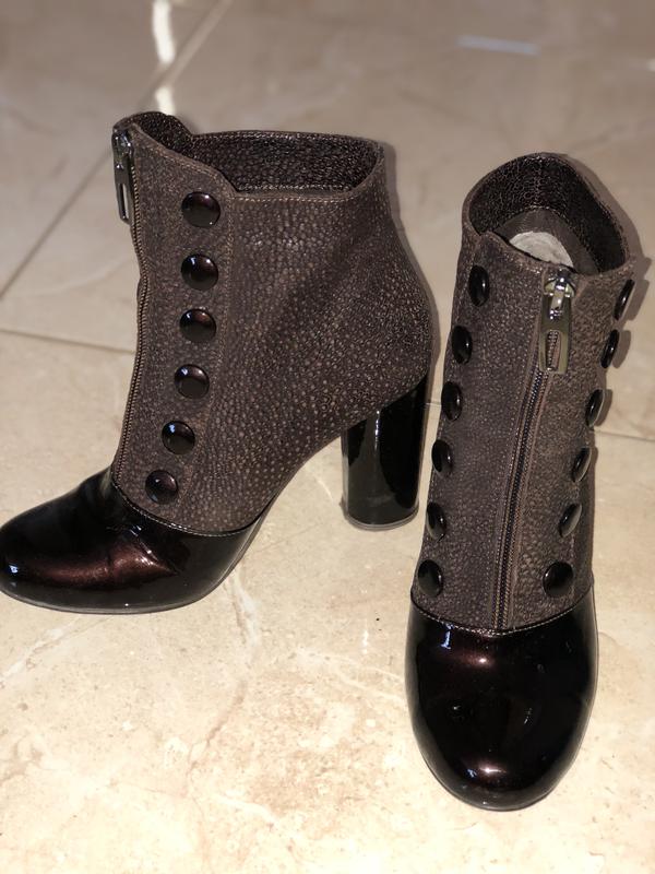 Продам красивые ботиночки, шоколадного цвета. Спереди молния, подойдут и на высокий подъем. Очень стильно смотрятся на ножке, так же к ним есть сумочка. Из нюансов: есть маленькие царапинки на каблуке и на передней части лака, но они поверхностные и не видны.