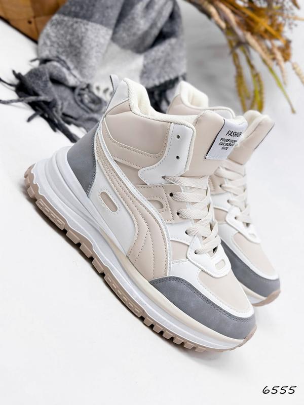 Черевики арт. L 6555 Матеріал: еконубук + екошкіра Колір : беж + білий + сірий Підошва: 5 см, спереду: 3 см Висота від п'ятки: 8,5 см Всередині екохутро Розмір 36- 41 36-22,5 см 37-23 см 38-23,5 см 39-24 см 40-24,5 см 41-25,5 см Ціна 1650 грн