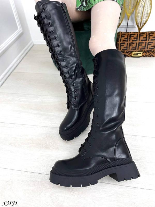 Чоботи зимові, збоку на блискавці + шнурування. Утеплені хутром Колір: чорний Матеріал: еко шкіра Сезонність: зима Код товару: 33131 ▪️Висота підошви спереду: 4см ▪️Висота підошви ззаду:6см ▪️Висота п'яти: 38см Розмірна сітка : 36-23,5; 37-24; 38-24,5; 39-25,5; 40-26; 41-26,5см