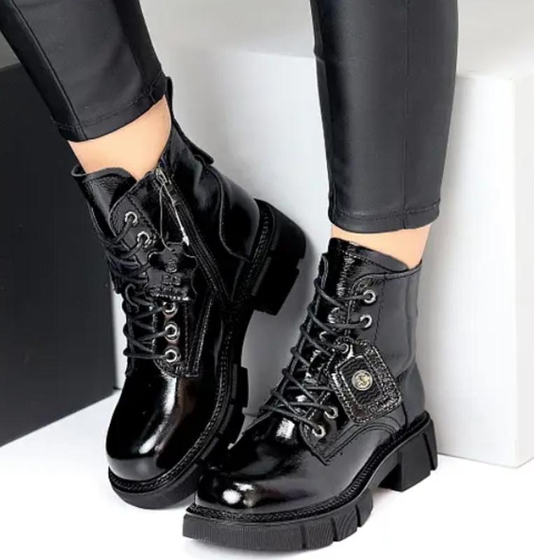 Черевики Матеріал - НАТУР. ШКІРА ГЛЯНЕЦЬ Всередині - Ворсистий фліс Сезон - Демі Колір - Чорний Висота від п’ятки - 12,5см Підошва - 4см/2,5см На середню стопу Розмір у розмір 36-23,5 37-24 38-24,5 39-25 40-25,5 41-26