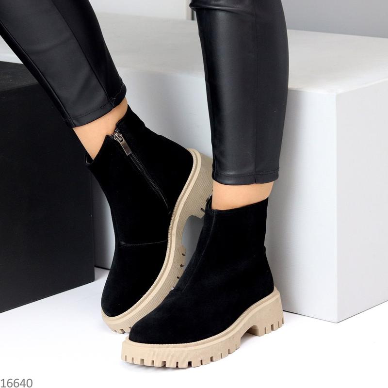 Черевики арт. S 16640 Размеры: 36-40 Материал: натур замша Внутри: ворсистый флис Сезон: деми Цвет: черный/беж Высота от пятки: 14см Подошва: 4,5см/2,5см Производитель: Украина На среднюю стопу Размер в размер 36-23 см 37-24 см 38-24,5 см 39-25 см 40-26 см Цена : 1650 грн