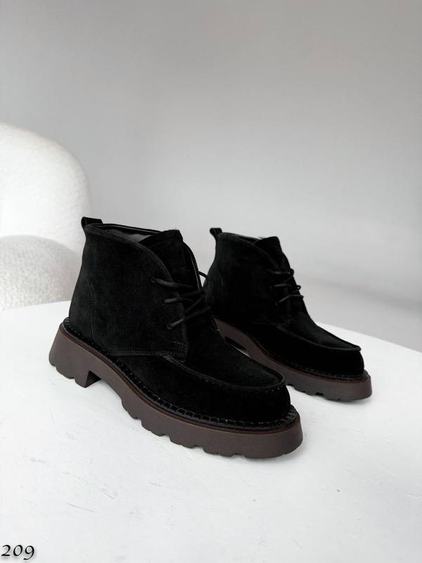 Код 209 Черевики Зима колір: Чорний матеріал: НАТУРАЛЬНА ЗАМША всередині: Еко-Хутро (у складі 30% овчини), висота від пятки 11 см підошва сзаду 5 см спереду 3 см виробник Україна з 36 по 40 розмір в розмір 36=23,5 см 37=24 см 38=24,5 см 39=25,5 см 40=26 см доступні на замовлення на відшив з 36 по 40