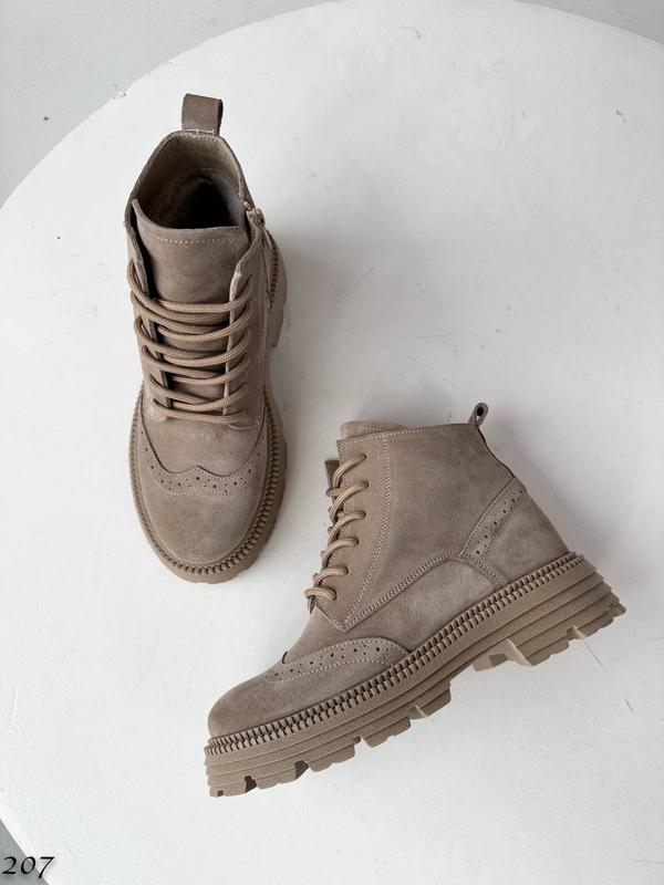 Код 207 Черевики Зима колір: Бежевий матеріал: НАТУРАЛЬНА ЗАМША всередині: Еко-Хутро (у складі 30% овчини), висота від пятки 11 см підошва сзаду 5 см спереду 3,5см виробник Україна з 36 по 40 розмір в розмір 36=23,5 см 37=24 см 38=24,5 см 39=25,5 см 40=26 см доступні на замовлення на відшив з 36 по 40