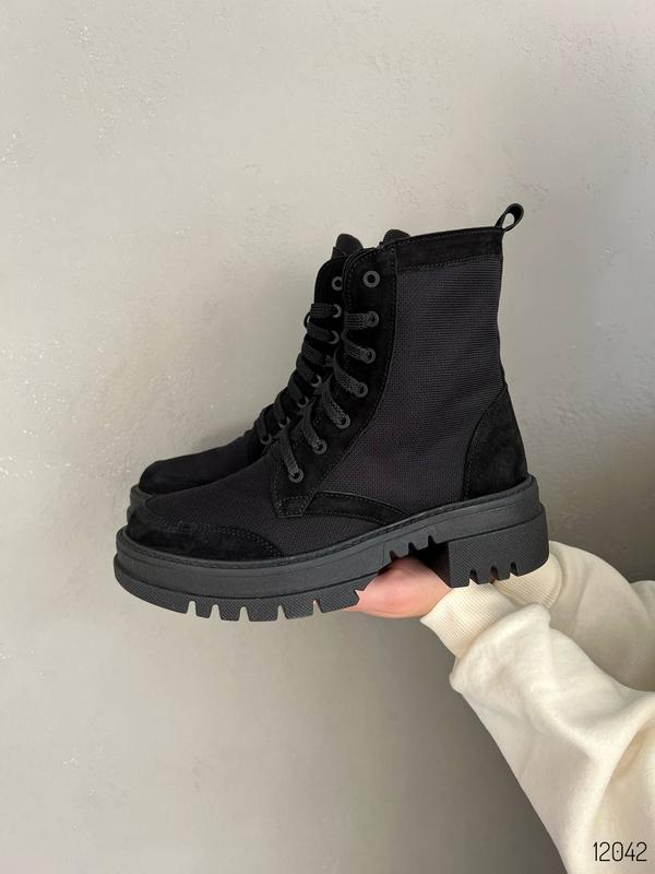 Код 12042 Черевики ДЕМІ Натуральна замша Водовідштовхувальна тканина Колір Black Висота від підошви 14см Підбор 5,5см Підошва 3,5см Всередені байка Розмір у розмір Виробник Україна 36-23,5см 37-24см 38-24,5см 39-25,5см 40-26см Доступні під замовлення у розмірах 36-41