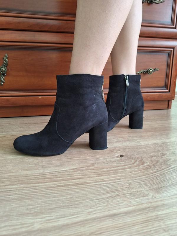 В середине полностью кожа, верх нубук, каблук 7см.набойки не стертые,в коробке есть запасные, состояние новых, без дефектов, удобные, стелька 25см.