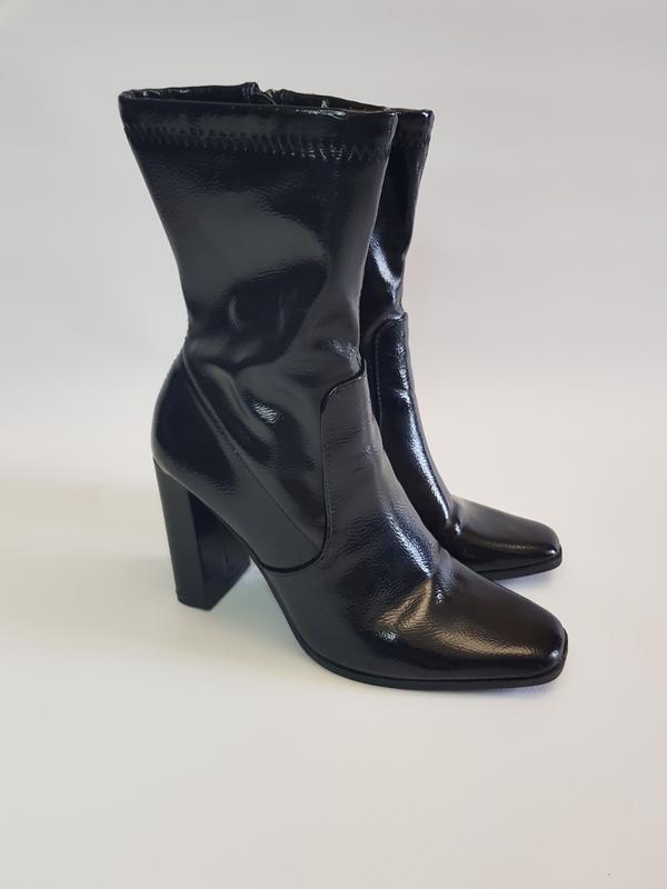 Ботинки лаковые на высоком каблуке Размер указан 37 Идут на стопу 23,2- 23,5 Каблук 9 см Высота от пола 26 см ПО вверху 13,5 На стопу не шире 9 см Состояние отличное, следы носки небольшие, набойки целые, молнии рабочие