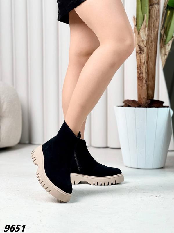 Сезон зима ❄️ Материал натуральная замша. Внутри полушерсть 70/30. Цвет черный на беж подошве. Высота подошвы 4 см. Высота от пятки 13,5 см. На молнии ⚡ Производитель Украина💙💛 Размер по сетке: 36 - 23,5 см 37 - 24,0 см 38 - 24.5 см 39 - 25,0 см 40 - 26,0 см