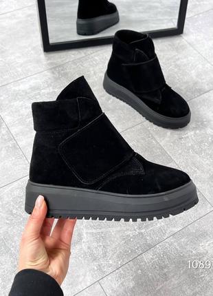Код 1089 Ботинки зимние Khutro Цвет: черный Материал : Натуральная замша Сезон : зима ( штучне густе хутро) Подошва : 4,5 см Размеры: 36-40 36 - 23см 37 - 23,5см 38 - 24,3см 39 - 25см 40 - 25,5 см Цена : 1950 грн