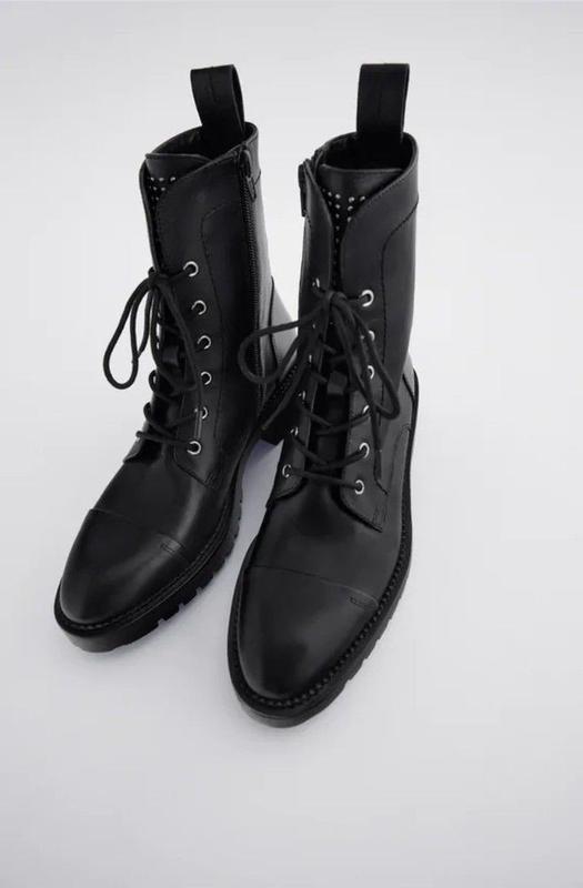 Шкіряні демісезонні ботильйони з заклепками на язичку Zara Розміри на підошві вказаний 39 але устілка 26см підійде і 40 чудово🫶 Висота каблука 4,5см. Йдуть на вузьку і стандартну ніжку👌 Чорні шкіряні черевики на низькому каблуці. ⚠️Шнурівка ⚠️Заклепки мілкі на язичку ⚠️Шкіряна петелька ззаду ⚠️Застібка на блискавку з внутрішньої сторони ⚠️Гнучка устілка з високотехнологічної синтетичної піни для зручності при носінні. ⚠️Склад‼️ Верх ↪️100% бичача шкіра Підкладка ↪️57% бавовна 15% поліурітан 10% поліестер Підошва↪️ 100% каучук Устілка↪️ 100% козяча шкіра По стану відмінні на 5. ♻️Без жодних дефектів по шкірі. ♻️Без без заломів потертостей тріщин ... В середині також супер. Із міні недоліка підтерті набійки на каблуці. Які можна з легкістю замінити у майстра взуття. На всі питання дам відповідь ⚠️
