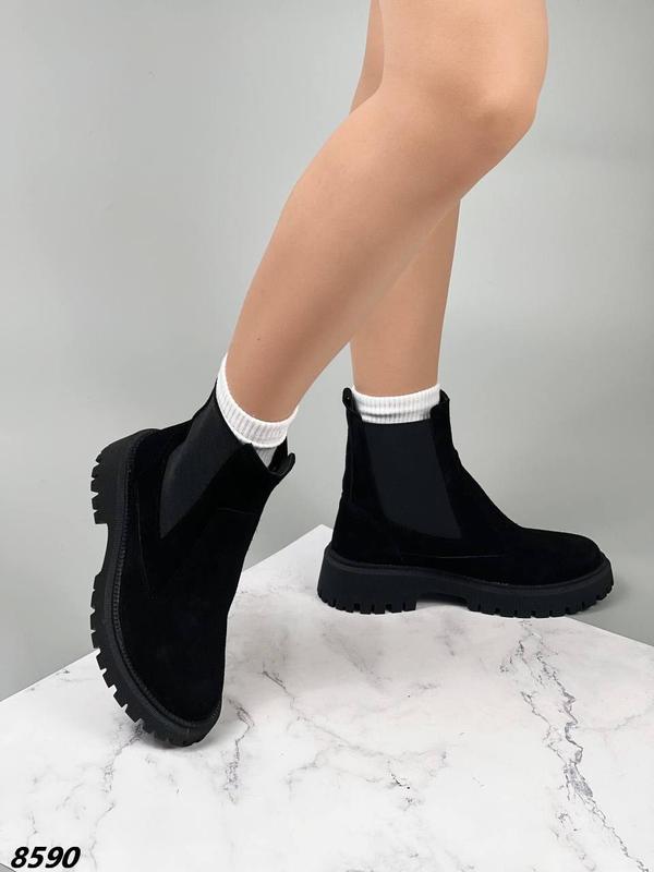 Код 8590 Материал натуральная замша. Цвет черный 🖤 Сезон зима ❄️ Внутри набивной мех. Высота обуви от пятки 14 см. Высота подошвы 4,5 см. На резинке. 🛒Размер по сетке: 36 - 23,5 см 37 - 24,0 см 38 - 24.5 см 39 - 25,0 см 40 - 25,5 см