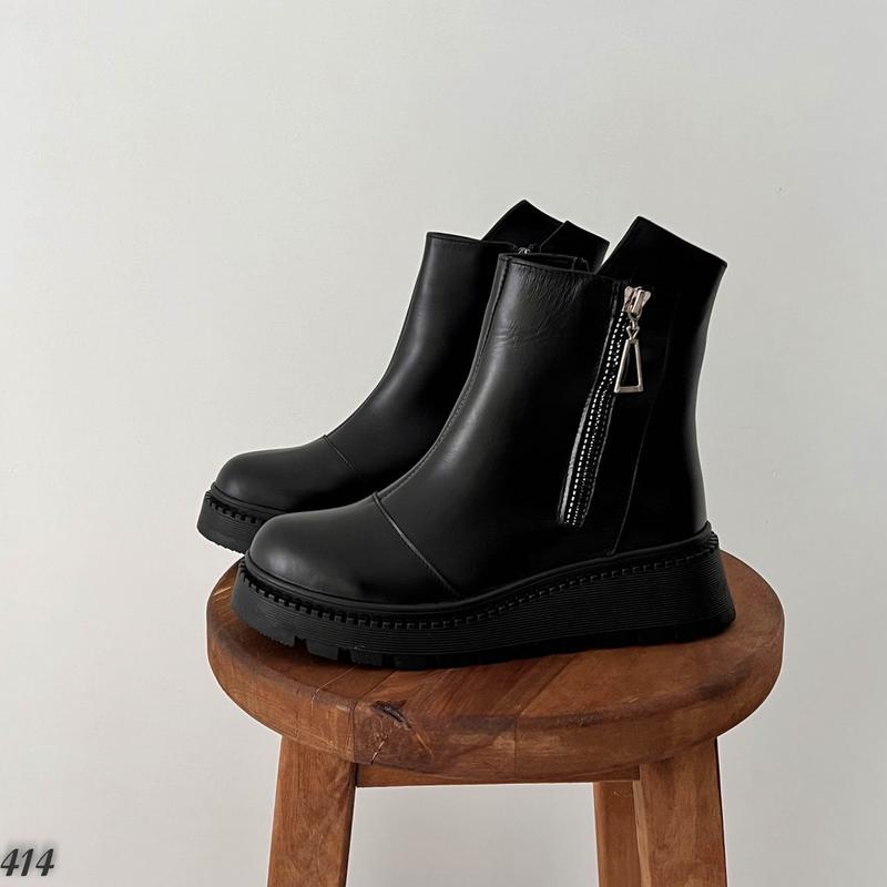 Новинка: Жіночі зимові Черевики Арт: 414 Колір:Чорний Матеріал: Натуральна шкіра Всередені Набивне хутро 70/30 Висота від підошви:14 см Підошва: 2,5-5см Розмірний ряд з 36 по 40р. Виробник Україна 36=23,5 см 37=24 см 38=24,5 см 39=25,5 см 40=26 см