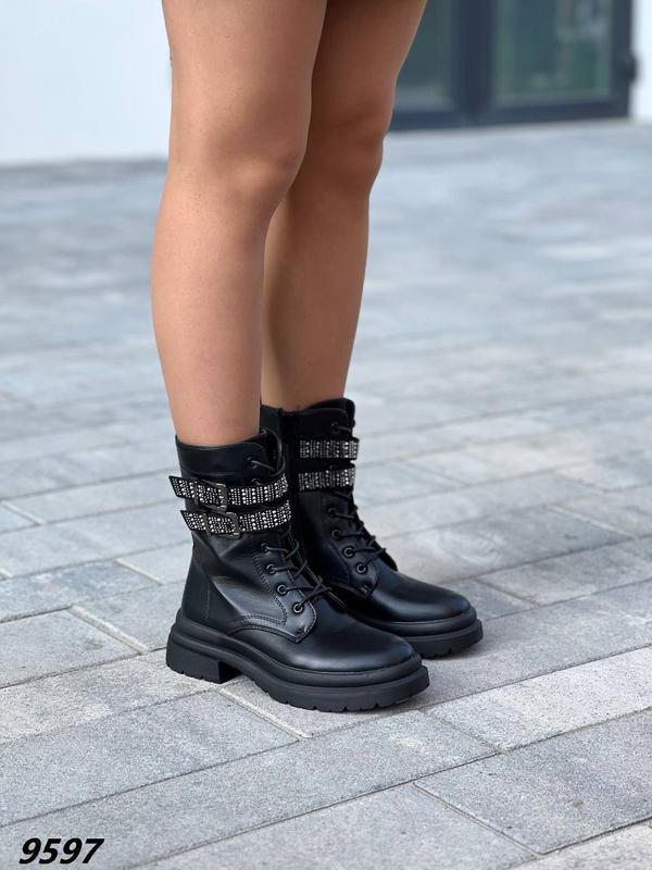 Код 9597 Ботинки Материал эко кожа Цвет черный Сезон деми Внутрь флис Высота обуви от пятки 17 см Высота подошвы 5,5 см На молнии+ шнуровке Размер по сетке: 36 - 23,5 см 38 - 24.5 см 39 - 25,0 см 40 - 25,5 см