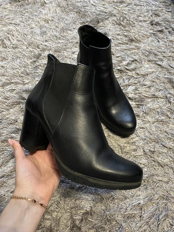 Повністю шкіряні полусапожки на квадратному каблуці 7 см, висота 18 см до найвищої точки. Розмір 37 ( 23,5 см). Видно що носилися, але майже не замітно на фото показано. У Хорошому стані)