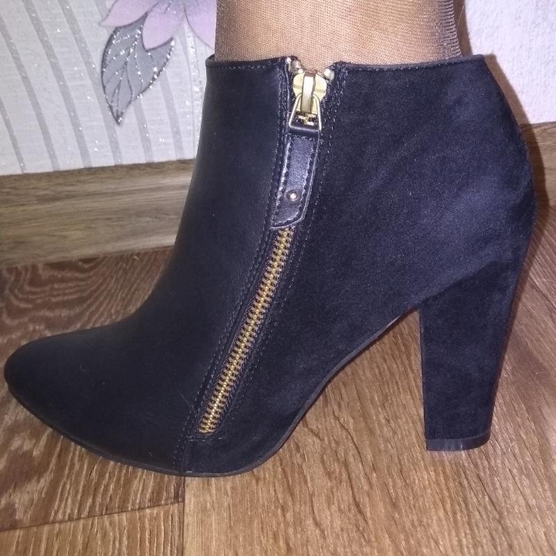 Новые ботиночки фирмы Mohito, размер 39, длина стельки 25.5, высота каблука 10 см, удобная колодка. очень круто смотрятся на ножке. Новые, коробка не сохранилась, из недостатков- еле заметный след, какая-то полосочка, видимо от клея.