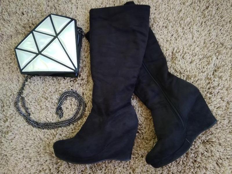 Текстильные сапожки под замш. Голенище не сильно узкое, можно одевать на штаны. 38р, 25см по стельке, высота платформы 8.5*1.5см. ширина голени по верху 39см, есть резинка.
