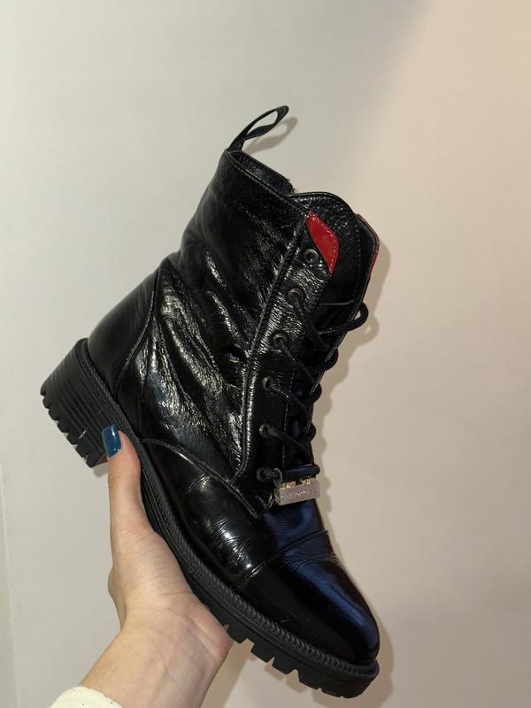 Натуральна лакована шкіра, утеплені шерстю На шнурівці, додатково є замочок Розмір 39 (25,5 см) В хорошому стані, дуже елегантно виглядають на ніжці На вузеньку ніжку
