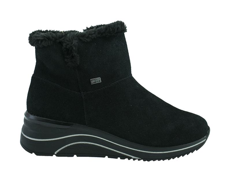 Комфортные женские зимние ботинки немецкого производства, выполнены из замши в чёрном цвете, внутри утеплены овчиной, а сверху идет меховая опушка. Подошва сделана из полиуретана. С внутренней стороны есть змейка. Германия, замша, чёрный, зима, овчина